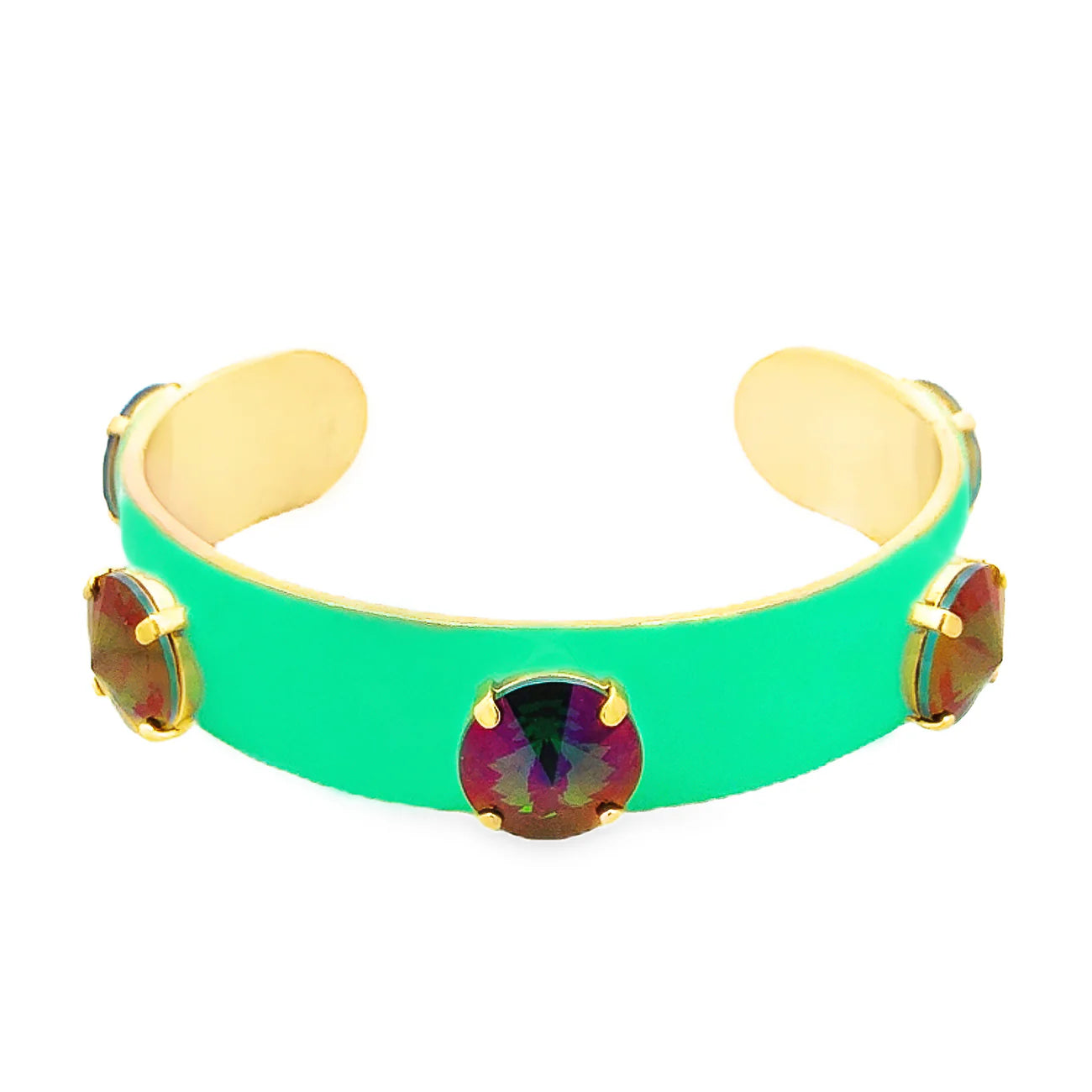 The Linsey Cuff - a playful and unique addition to your accessory collection. Made in Canada with antique gold plated brass, high quality crystals, and hand painted enamel, this cuff is a one-of-a-kind piece that will add a touch of quirk to any outfit!
