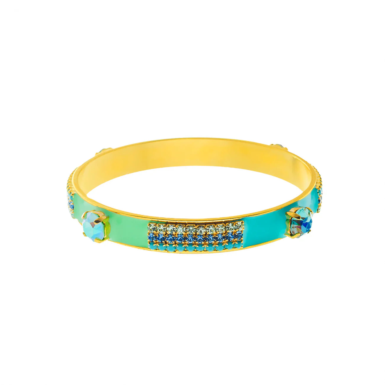 Add a touch of whimsy to your outfit with the Mireya Bangle! This antique gold brass bangle is hand painted with colorful enamel, accented by high quality crystals for a touch of sparkle. With an inner circumference of 20 cm, 2.5" inner diameter, this bangle comfortably fits most wrists. A playful addition to any jewelry collection.